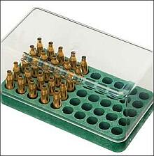 SMART NEW PRODUCT--Covered Loading Tray: File this in the "it's about time" department. There are times when we have to leave a loading bench with charged cases sitting in a loading block. We've always nervous about doing so--sometimes putting a piece of cardboard on top to make sure nothing falls inside. Also, with loaded rounds, before they're placed in field boxes, it makes sense to have some protection for bullet tips. Cabela's recently introduced a covered loading block that seems like a real good idea. We'd like Sinclair Int'l to offer a similar optional cover for their fine Delrin loading blocks that we use. The Cabela's unit costs $11.99 and is item ZS-21-5760: (127) for .308 case-head diameter, and (126) for .223 cases.